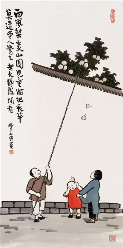 西风梨枣山园儿童偷把长竿,
