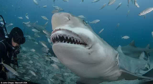 距离野生动物摄影师约翰沙帕仅有几英寸的地方一只柠檬鲨张开血盆大口。