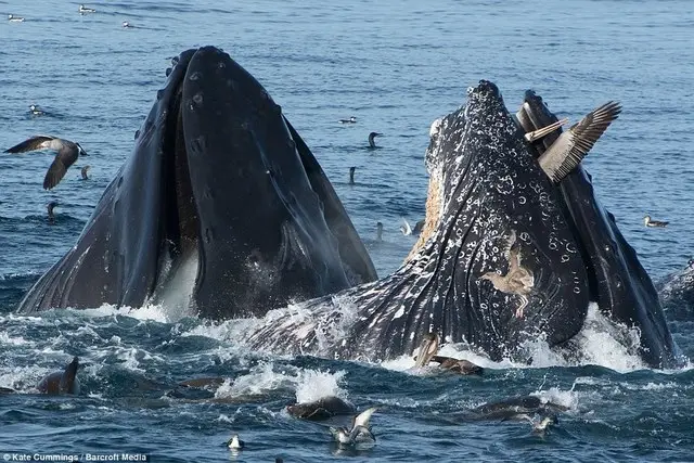 一只鹈鹕在捕鱼的时候险些被一只座头鲸吞掉。
