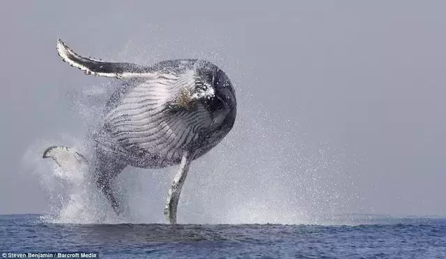 南非圣约翰港口附近海面,一只巨大座头鲸跃出水面。史提芬本杰明用镜头记录了1000多头鲸鱼从南非海岸迁徙到莫桑比克和马达加斯加之间温暖水域的过程。