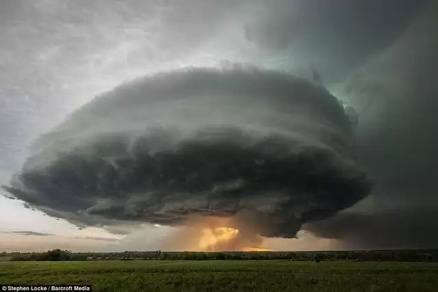 在美国堪萨斯州,一个基于超级雷暴的单体气旋,带来了暴雨和冰雹。